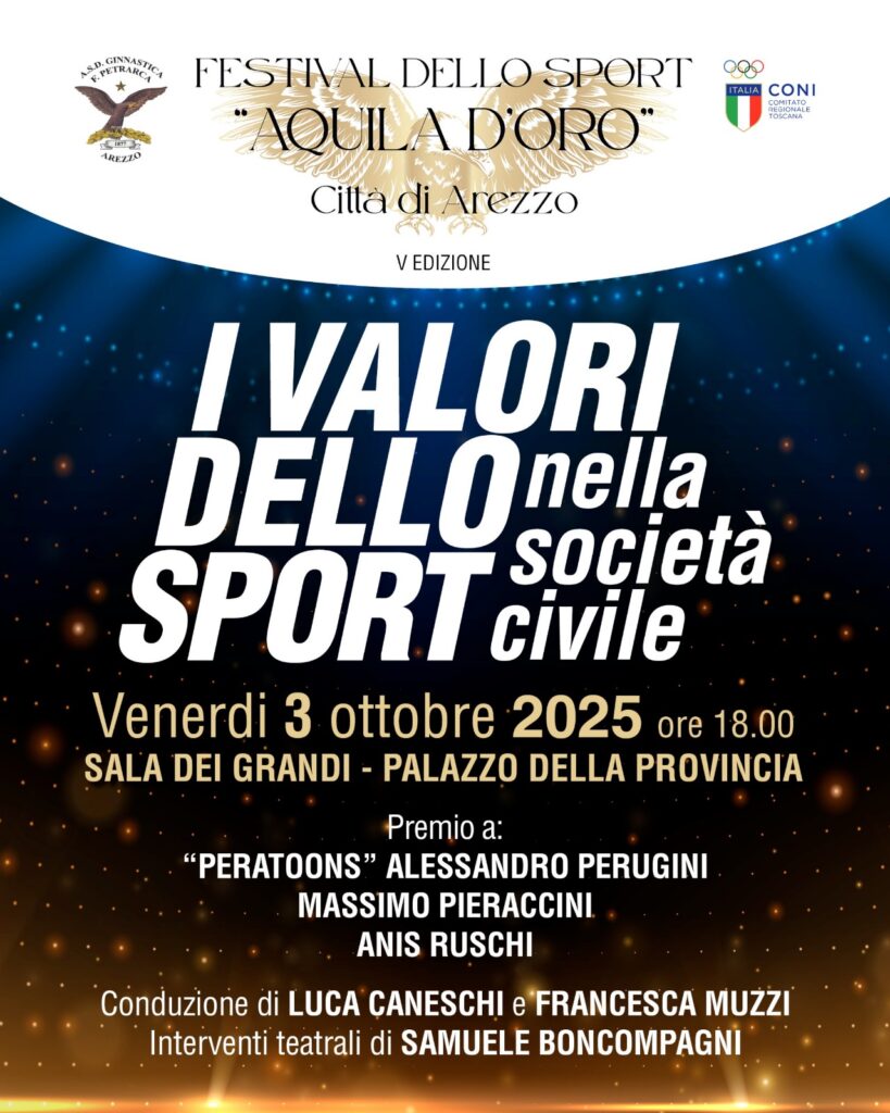 La quinta edizione del Festival dello Sport “Aquila d’Oro – Città di Arezzo”, in programma il 3 ottobre 2025 nella Sala dei Grandi della Provincia di Arezzo, celebra tre figure della società civile che incarnano i valori dello sport e dell’impegno sociale. Promosso dalla Ginnastica Petrarca e dal Comune di Arezzo, con il supporto di Coni Toscana, Regione e Provincia, l’evento mira a valorizzare l’etica, la resilienza e la solidarietà come modelli per le nuove generazioni.